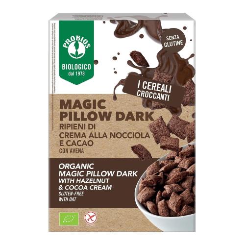 I Magic Pillow Dark ripieni di Crema alla Nocciola e Cacao sono dei croccanti e golosi cuscinetti di riso e avena, biologici e senza glutine. Ottimi a colazione con latte, yogurt e/o muesli, ma anche da sgranocchiare in ogni momento della giornata. Prova anche la versione classica Magic Pillow ripieni di Golosa crema al Cacao oppure la versione Magic Pillow Extra Dark Senza Zuccheri Aggiunti.