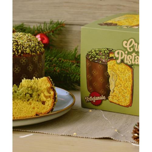 UOVA pastorizzate, miscela base (amidi: patate, mais, tapioca; fibre vegetali: psyllium, inulina; farina di riso, emulsionante: E471; proteine vegetali: pisello; addensanti: gomma di guar, E464; sale, conservante: acido sorbico, enzimi); BURRO, zucchero, acqua, miscele base (amidi: FRUMENTO deglutinato, mais; destrosio, fibre vegetali: psyllium, inulina; pasta acida di mais, farina di teff rosso, farina di lenticchie, addensanti: gomma di guar, E464; farina di mais tostata); cioccolato fondente (7%) (zucchero, pasta di cacao, burro di cacao, emulsionante: lecitina di SOIA, aroma naturale di vaniglia); farcitura al PISTACCHIO (6%) (zucchero, oli vegetali: girasole, burro di cacao; PISTACCHI, LATTE scremato in polvere, siero di LATTE in polvere, LATTOSIO, aromi naturali, colorante: clorofilla; emulsionante: lecitina di girasole); granella di PISTACCHIO Verde di Bronte D.O.P. (1%), lievito di birra, alcool sciroppo di riso (farina di riso, acqua); pasta di scorza di limone candita (scorzone di limone candita: scorzone di limone, zucchero, sciroppo di glucosio; zucchero, sciroppo di glucosio); conservante: E202.